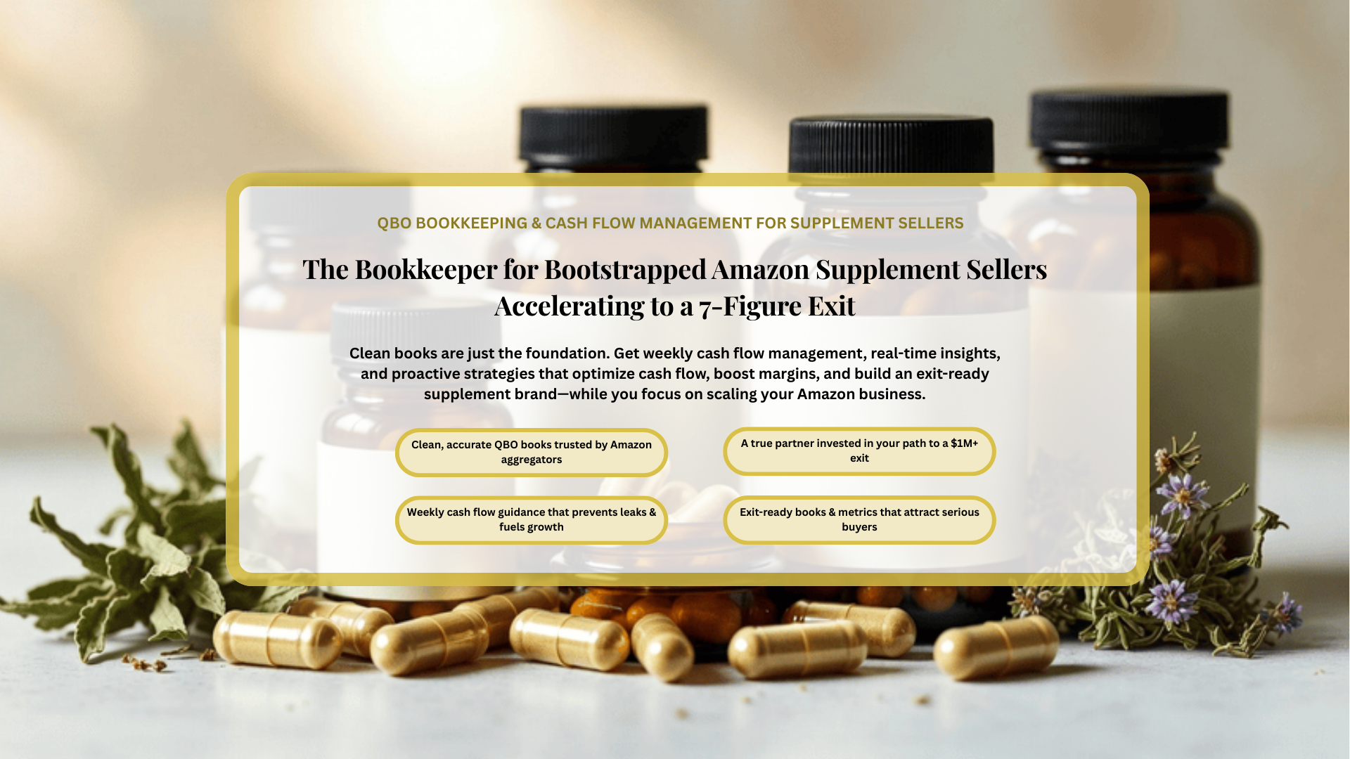 Bootstrapped Amazon FBA sellers of health & wellness supplements who are frustrated with messy books, unpredictable cash flow, or missed profit opportunities — and are committed to building a scalable, exit-ready brand rather than just maintaining the status quo.